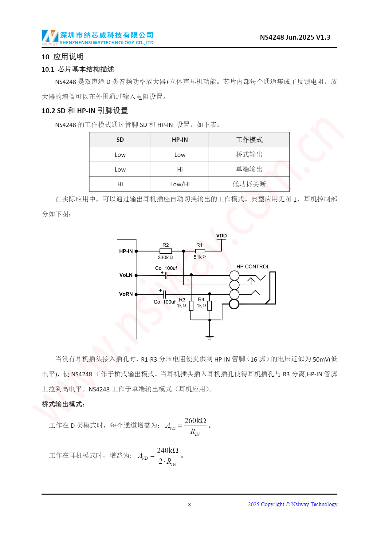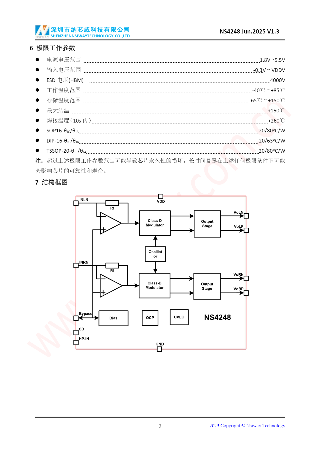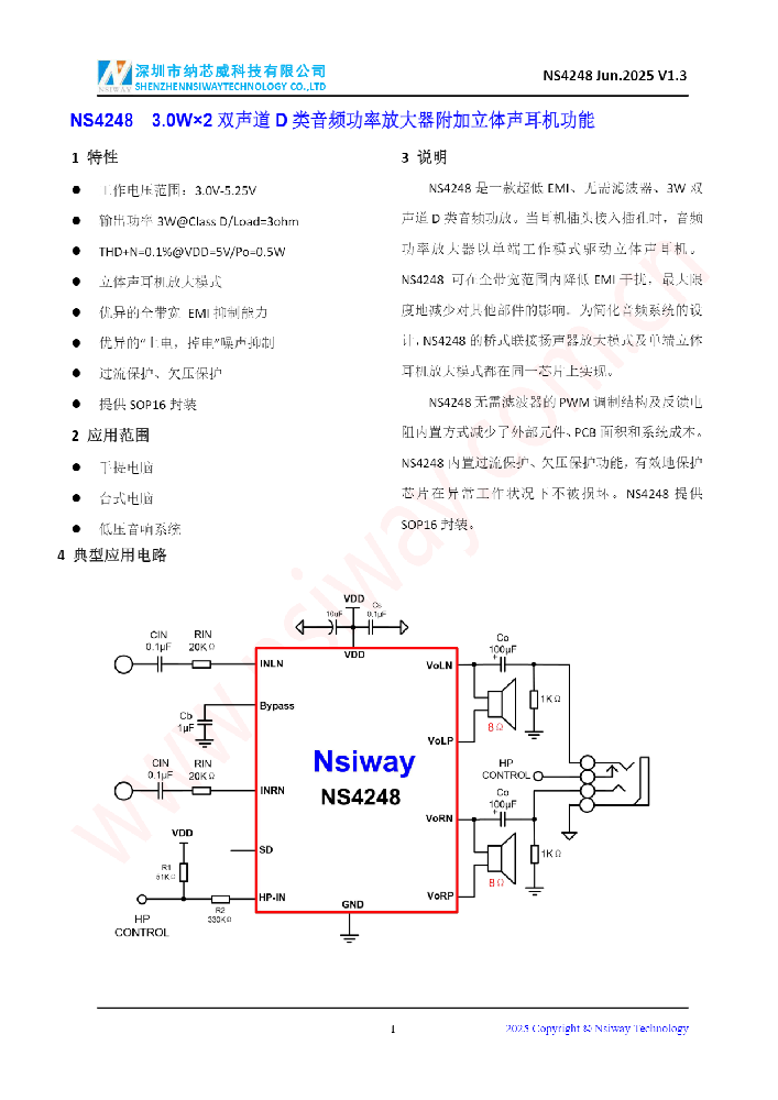 NS4248 3.0W×2 雙聲道 D 類音頻功率放大器附加立體聲耳機功能